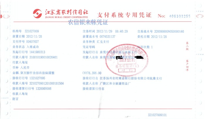 客戶對(duì)大貨非常滿意,當(dāng)即在網(wǎng)銀向我們付余款182924元。