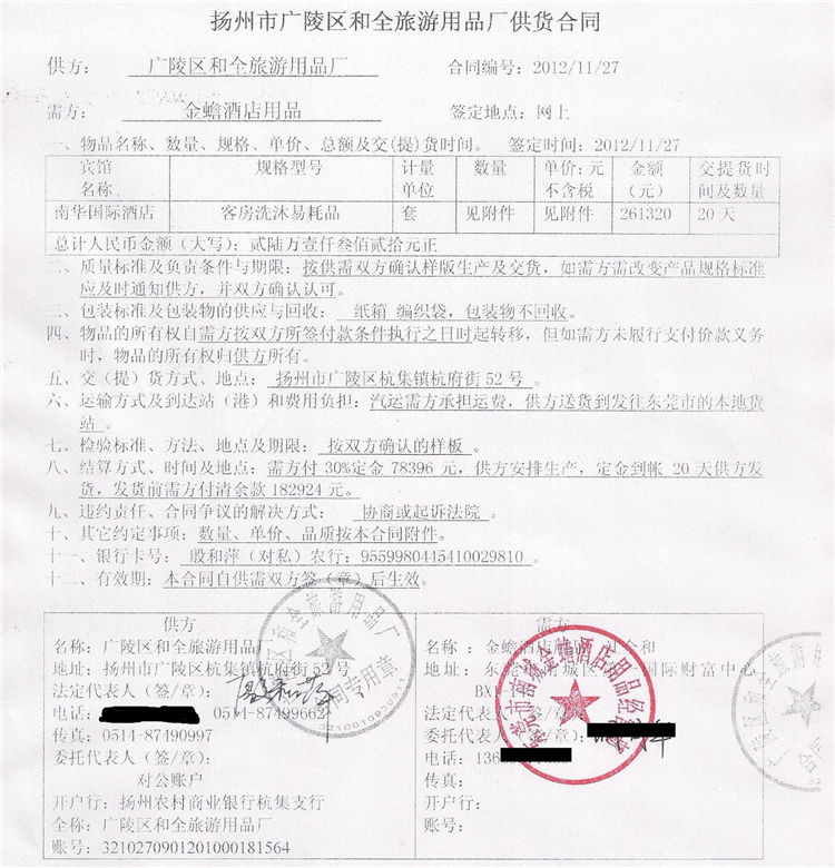 南華國(guó)際酒店是一家五星級(jí)高檔酒店,我們與客戶東莞市某著名酒店用品公司,交流的過(guò)程中,對(duì)方老總就表達(dá)了希望酒店配套洗漱品也能夠顯示出高檔次,從客戶舒適度來(lái)考慮用品的配置。為此我們均按照超五星的標(biāo)準(zhǔn)進(jìn)行客房用品配置。 在與客戶達(dá)成一致后,對(duì)方老總當(dāng)場(chǎng)拍板簽定供貨合同。